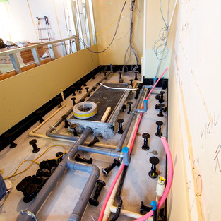 厨房の土間には防水層を施しています。その上にグリストラップの場所を決めて仮固定し、モルタルを流し込んで土間を生成します。今回の厨房は施主様の希望でドライキッチンという方法をとりました。ドライキッチンとは簡単に言うと水を流さない厨房のことです。メリットとして工期短縮・コスト削減が見込めます。土間の上に水道・ガス設備を各所にめぐらせていきます。こちらも束を設置して床を上げます。